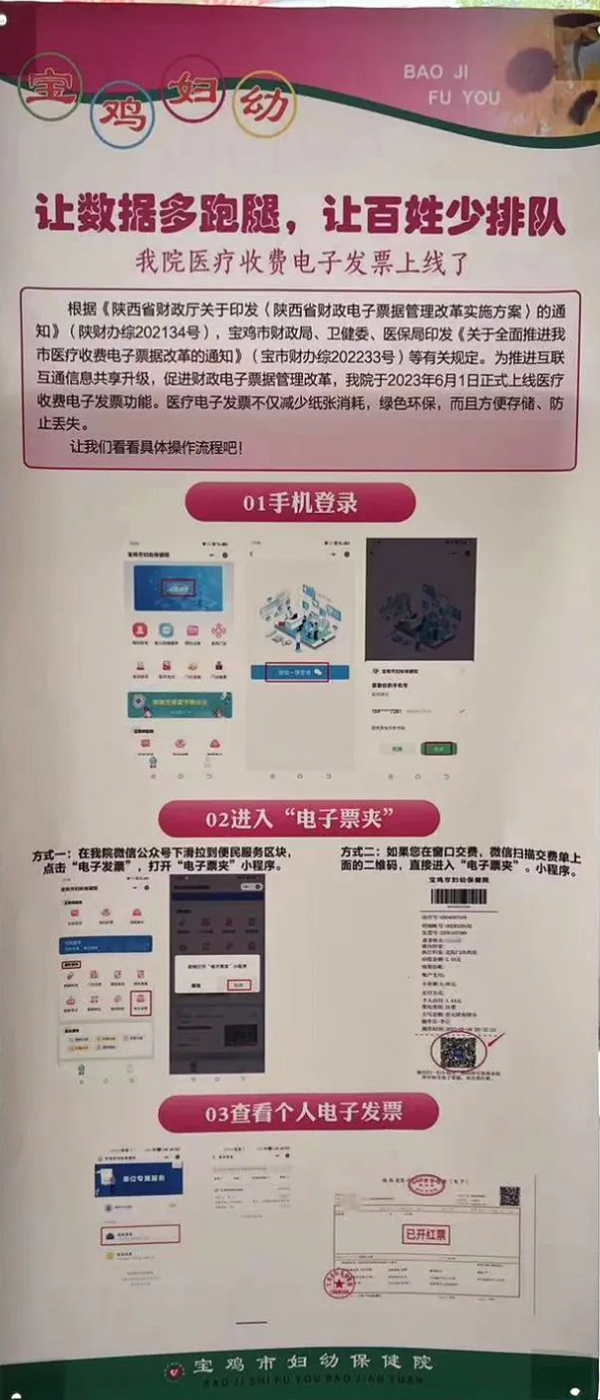 近日,我市妇幼保健院、凤翔区医院分别开出首张医疗收费电子票据,率先在全市医疗机构推进医疗收费票据电子化改革。这两家医院医疗电子票据的开通和上线,标志着我市财政医疗票据管理工作正式迈入“无纸化、电子化、便民化”时代,也是我市深化票据管理“放管服”改革、推进“互联网+政务服务”的一项重要举措,同时实现了财政票据规范、科学、高效化管理。