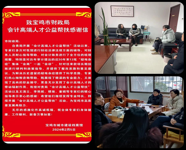 座谈中,企业负责人对各帮扶团队的工作给予充分肯定。一是帮助理清单位多年来旧账,解决财务“患”的问题。二是解决了报表分析“虚”的问题。三是解决了执行政策“偏”的问题。特别是现场赠送的减免税收政策宣传册,更是受到欢迎。在走访交流中,进一步了解了企业运转经营情况及其它需要解决的一些难题,共同为企业发展建言献策。宝鸡城建档案馆还给市财政局及高端人才帮扶团队送来感谢信。