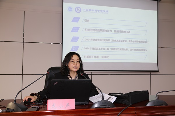 龙小燕教授从中央经济工作会议精神和2024年国务院政府工作报告切入,领学了习近平总书记关于财政工作重要论述、2024年经济社会发展总体要求和政策取向,深入分析了坚持稳中求进、以进促稳、先立后破,宏观政策逆周期和跨周期调节,以及积极的财政政策要适度加力、提质增效的政策安排。